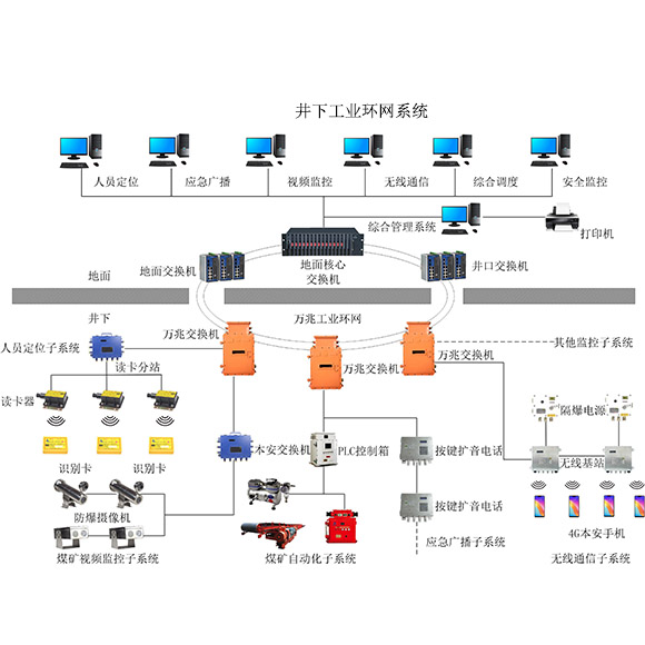 通過(guò)建設(shè)礦用Wi-Fi6無(wú)線網(wǎng)絡(luò)系統(tǒng)實(shí)現(xiàn)井下語(yǔ)音、視頻、數(shù)據(jù)、控制信令一網(wǎng)承載,井下各子系統(tǒng)業(yè)務(wù)匯聚于一個(gè)平臺(tái)。礦用Wi-Fi6無(wú)線網(wǎng)絡(luò)系統(tǒng)以萬(wàn)兆環(huán)網(wǎng)為骨干、千兆分支做傳輸,Wi-Fi6無(wú)線基站覆蓋到井下進(jìn)風(fēng)大巷、順槽、掘進(jìn)工作面、綜采工作面等地點(diǎn),下行提供以太網(wǎng)光電接口、總線接口。該網(wǎng)絡(luò)平臺(tái)可以為其他系統(tǒng)的建設(shè)提供就近、穩(wěn)定的基礎(chǔ)接入網(wǎng)。成熟的Wi-Fi 6無(wú)線信號(hào)覆蓋,能夠?qū)崿F(xiàn)大容量、高速率的無(wú)線數(shù)據(jù)、無(wú)線視頻、移動(dòng)語(yǔ)音傳輸和接入。